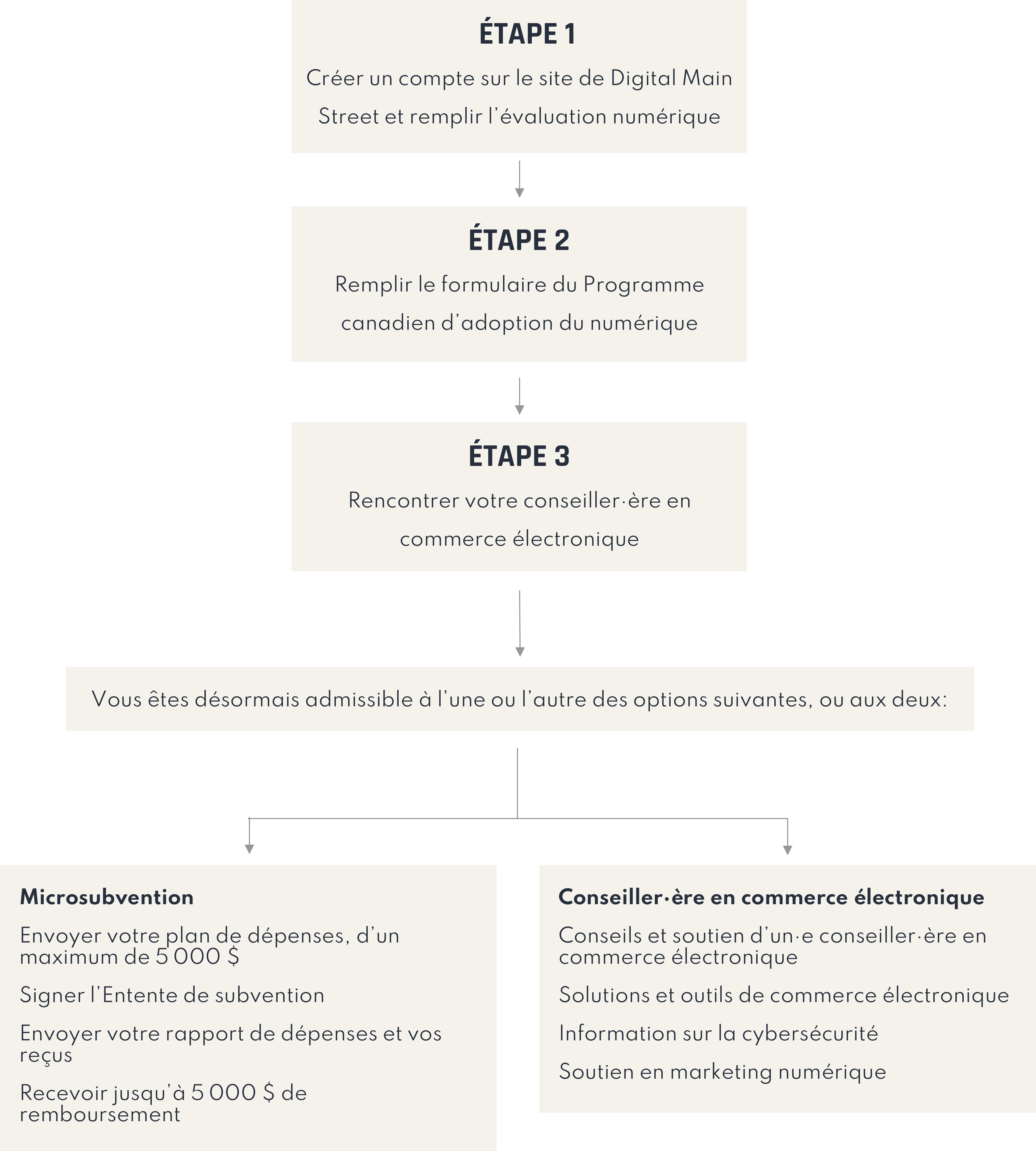Les demandes pour la subvention Développez vos activités commerciales en ligne sont envoyées par l’entremise de notre partenaire, Digital Main Street. Vous serez donc redirigé·e vers son site Web lorsque vous serez prêt·e à envoyer votre demande.
